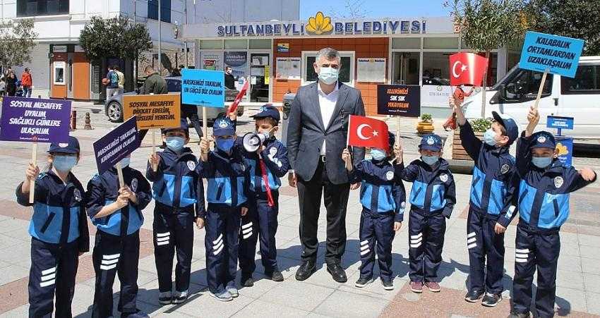 Sultanbeyli’de çocuklar zabıta oldu; esnaf ve vatandaşlara temizlik, mesafe ve maskenin önemini anlattı. 23 Nisan Ulusal Egemenlik ve Çocuk Bayramı öncesi Sultanbeyli’de farkındalık oluşturmak için zabıta kıyafeti giyen minikler, esnafları dükkânlarında ziyaret etti. Esnafa ve meydanda bulunan vatandaşlara uyarıda bulunan minikler, aynı zamanda yaşanan salgına yönelik tedbirlerin yer aldığı pankartlarıyla da Koronavirüs’e karşı farkındalık oluşturdu. Belediye Başkanı Hüseyin Keskin, çalışmalarından ötürü zabıta olan anaokulu öğrencilerine hediyelerini takdim etti.